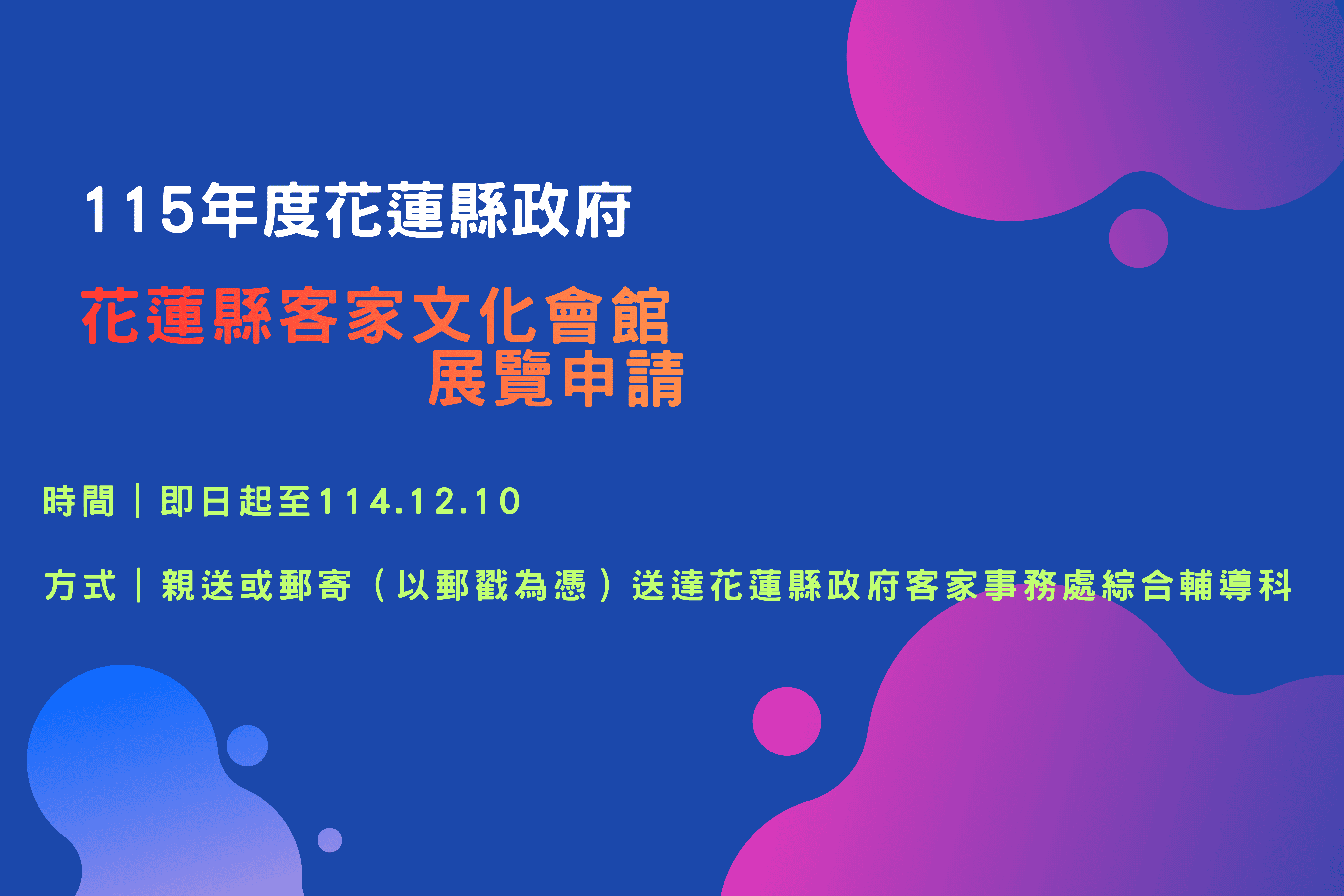 一、送件者請於114年12月10日前填妥紙本申請表件以親送或郵寄(以郵戳為憑)方式送達花蓮縣政府客家事務處, 申請表單請至花蓮縣政府客家事務處官網(https://hk.hl.gov.tw/)查詢下載。