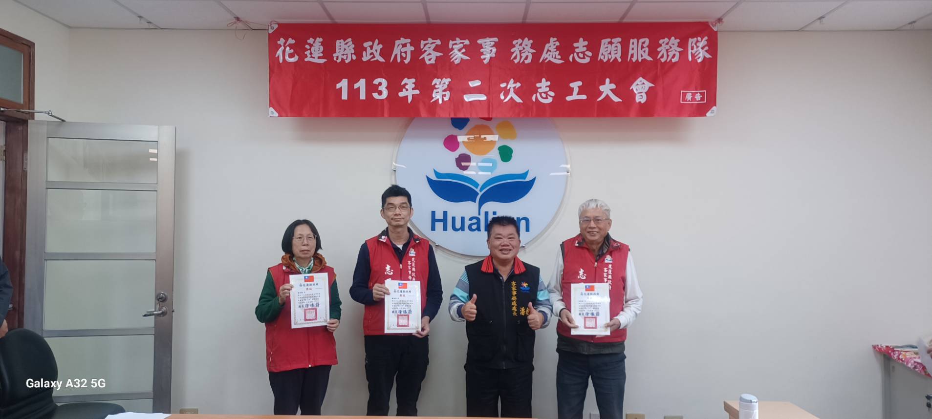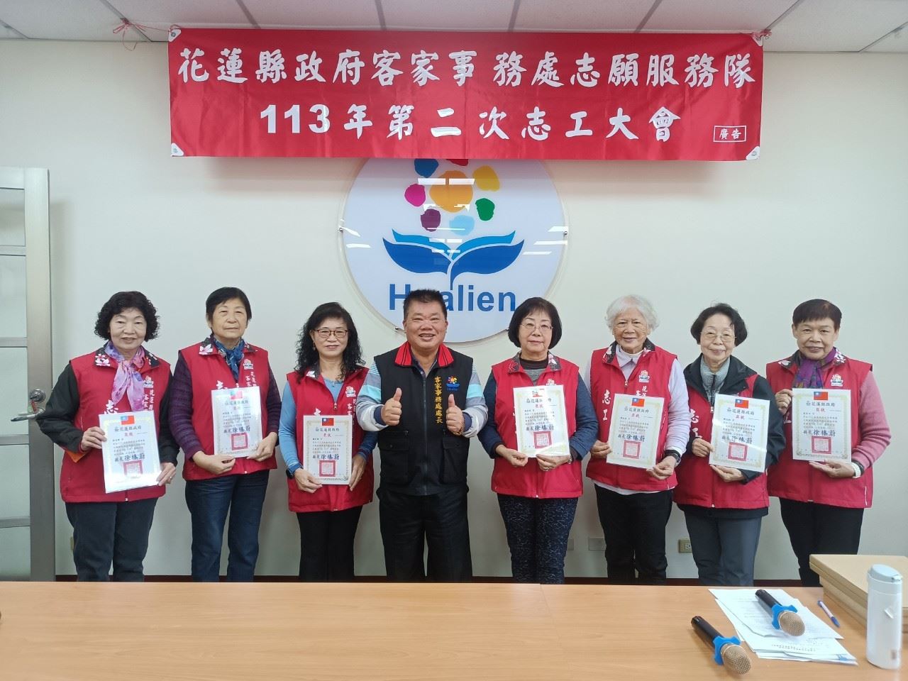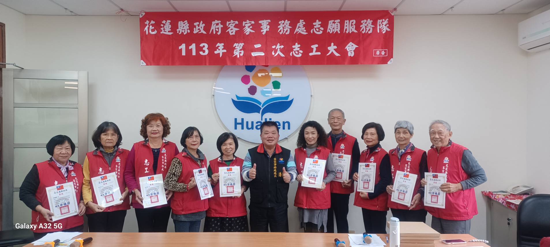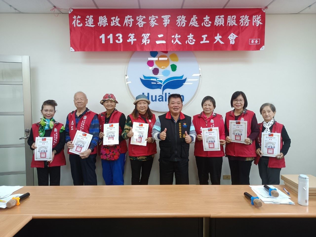 ◆時間: 113年12月29日(日)上午10時 ◆地點:客家事務處二樓會議室 ★會中頒發112年服勤時數績優志工~獲獎名單如下 ●金獎(年度服勤250小時以上):11人 黃鳳嬌、溫開俊、許美秀、林峰英、劉艾樺、袁麗珠、 林庭均、賴文章、邱桂枝、謝惠美、楊暢生 ●銀獎(年度服勤200小時以上):3人 張淑姬、蘇俊昇、林國棟 ●銅獎(年度服勤150小時以上):17人 黃玉女、蘇明德、李秀鳳、林美津、陳月華、張雅琇、 彭窓妹、陳招蓉、溫玉卿、謝璧蓮、邱玉妹、鍾彩鳳、劉素琴、陳淑媛、陳玉齡、吳惠玉、江淑湞、 ●績優長青志工(65歲以上服勤滿100小時以上至150小時): 羅文聰、徐菊、楊彩鈺、林清標、羅秀英、陳錵蘭、簡秋霞 參與志工:劉素琴/蘇俊昇/陳玉齡/劉艾樺/許美秀/邱美英/林峰英/鍾玉珍/張雅琇/蔣惠玉/林鳳琴/曾忠民/邱桂枝/林庭均/賴文章/黃玉女/謝璧蓮/李超運/劉碧蘭/邱寶珠/鄧美治/黃鳳嬌/鍾彩鳳/簡秋霞/蘇明德/陳月華/陳淑媛/林美津/吳玉秀/林鳳嬌/薛月娥/林國棟/羅文聰/溫玉卿/吳惠玉/李秀鳳/羅秀英/楊彩鈺/徐菊/謝惠美/李金璀/張淑姬/鵬窓妹/陳潤三//陳招蓉/楊暢生等47人