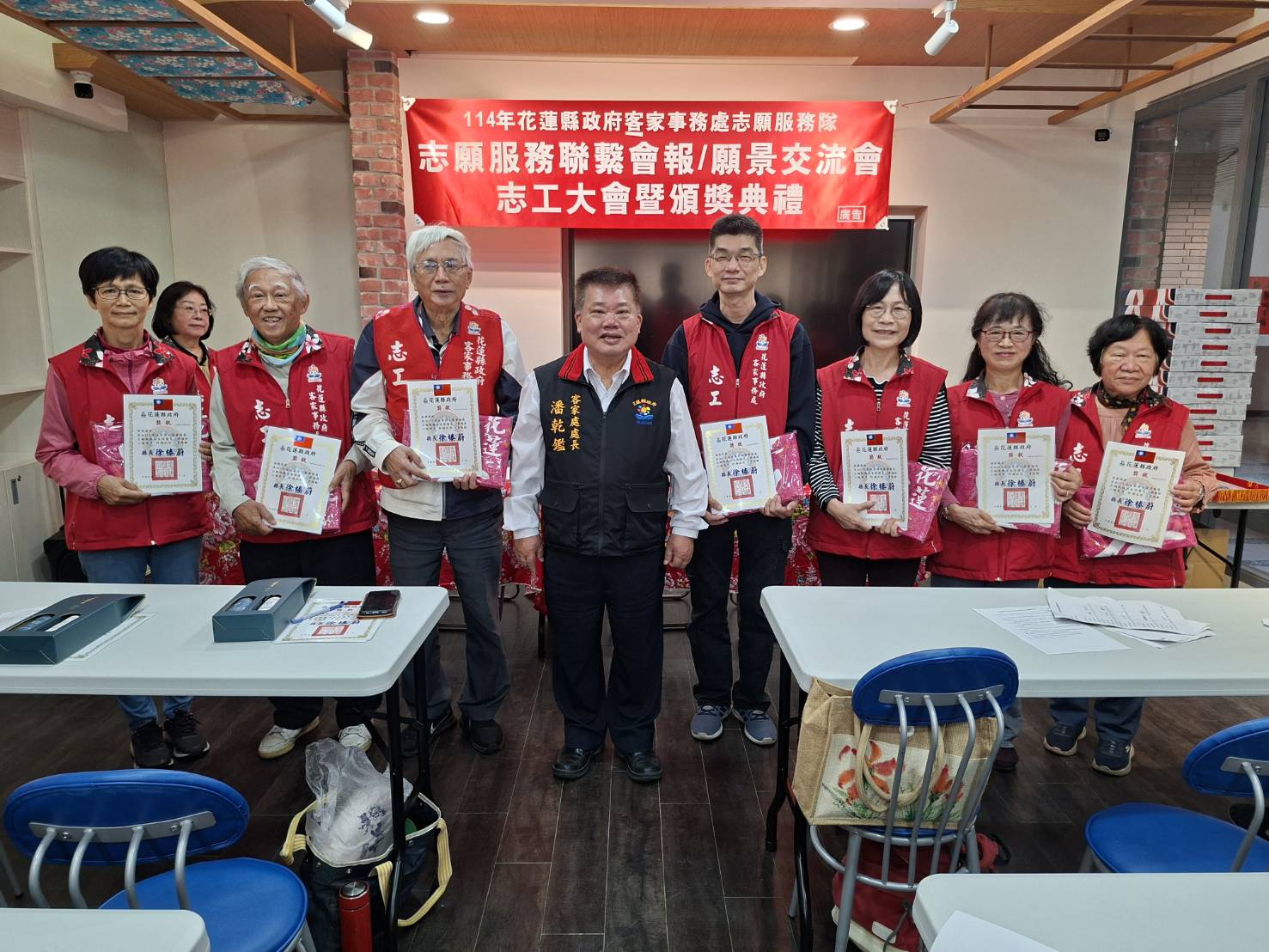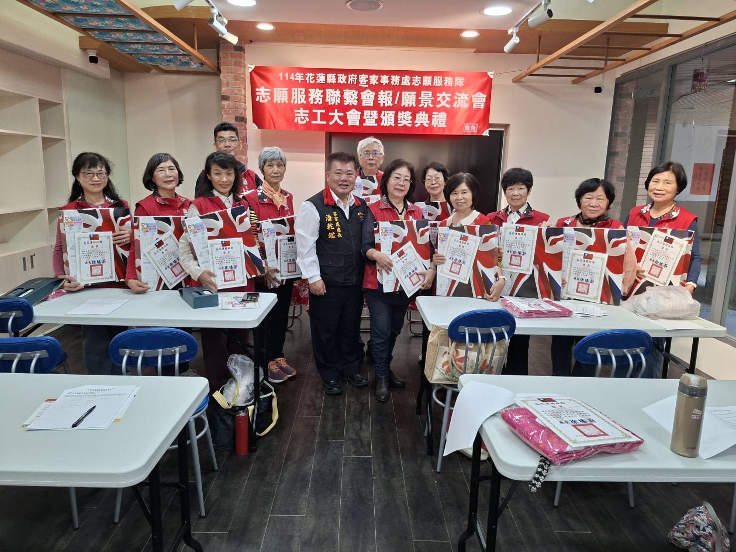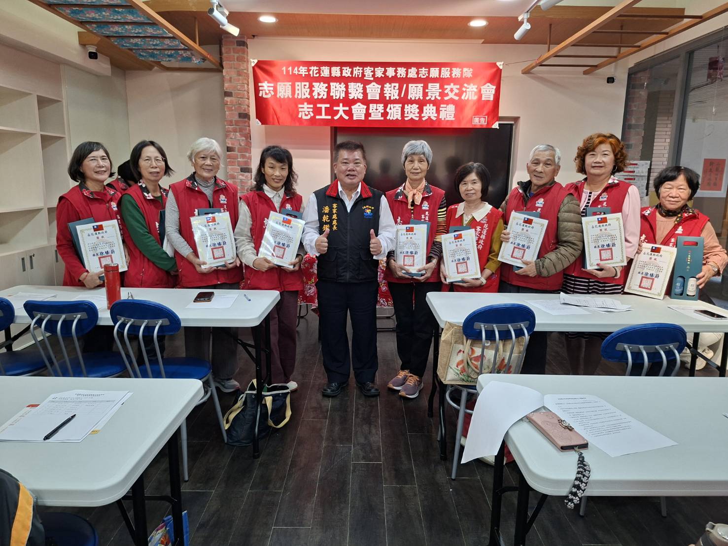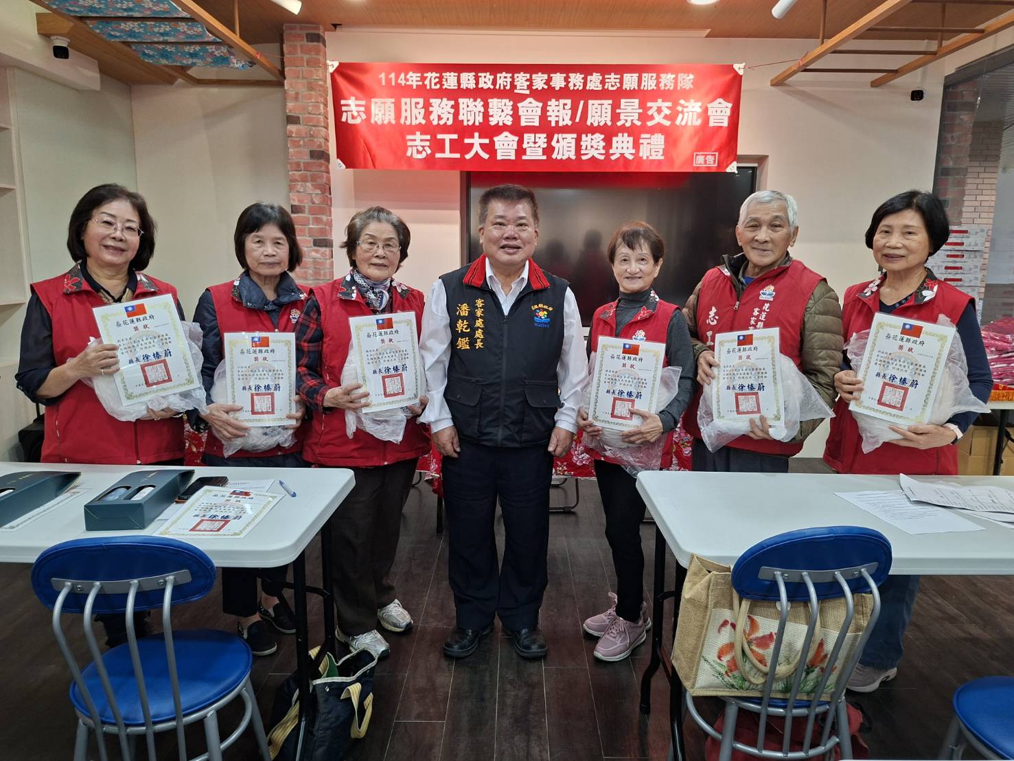 ◆時間: 114年12月7日(日)上午11時 ◆地點:客家事務處第二展示室 ★會中頒發113年服勤時數績優志工~獲獎名單如下 ●績優服勤獎:10人 黃鳳嬌、許美秀、林峰英、溫開俊、袁麗珠、謝惠美、劉艾樺、張淑姬、陳淑媛、林庭均 ●績優研習獎:10人 賴文章、邱桂枝、羅淑美、溫開俊、陳招蓉、林鳳琴、楊彩鈺、劉素琴、江淑湞、彭窓妹 ●熱心服務獎:10人 黃鳳嬌、鍾彩鳳、林鳳琴、林鳳嬌、賴文章、蘇俊昇、羅淑美、林國棟、楊暢生、劉碧蘭