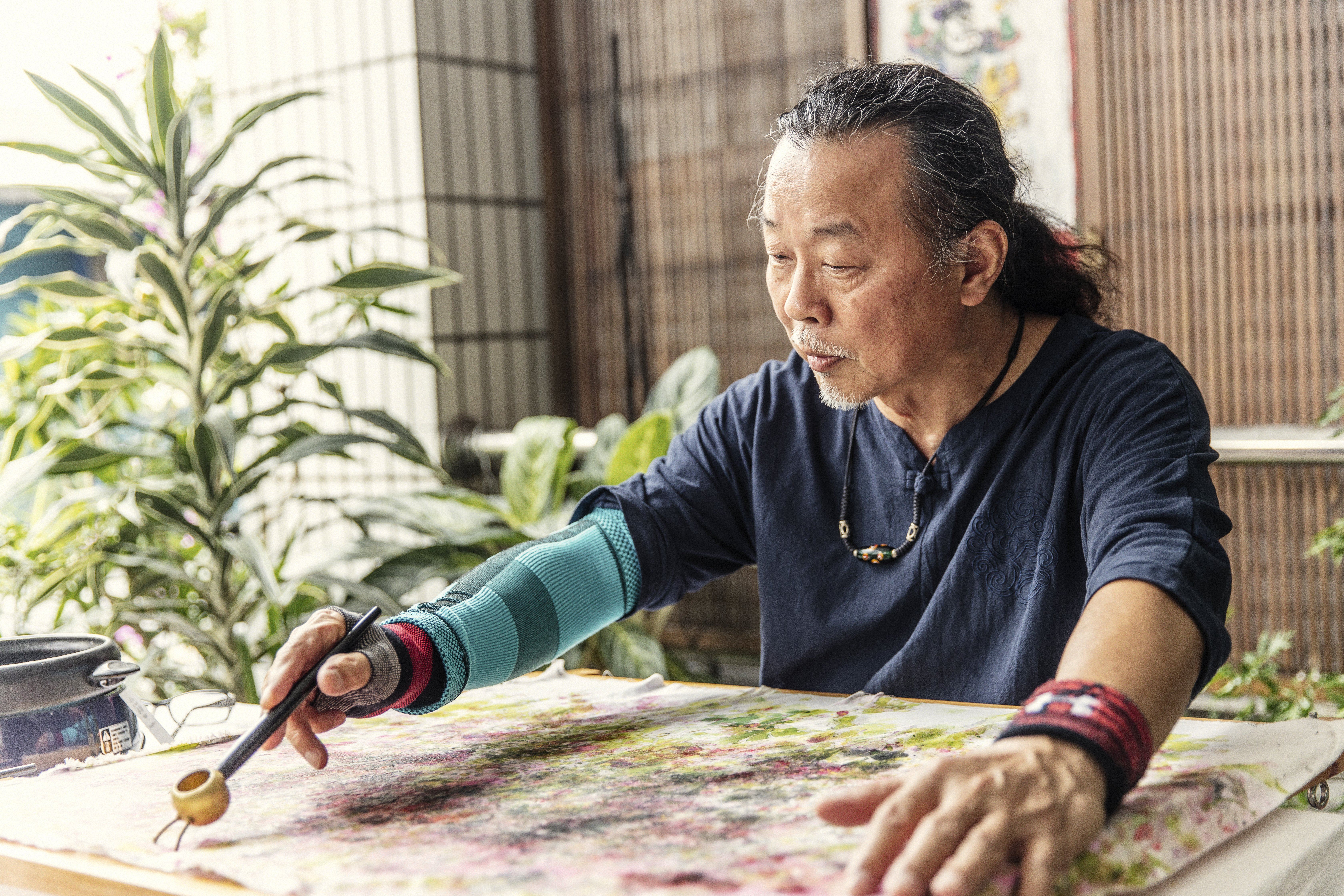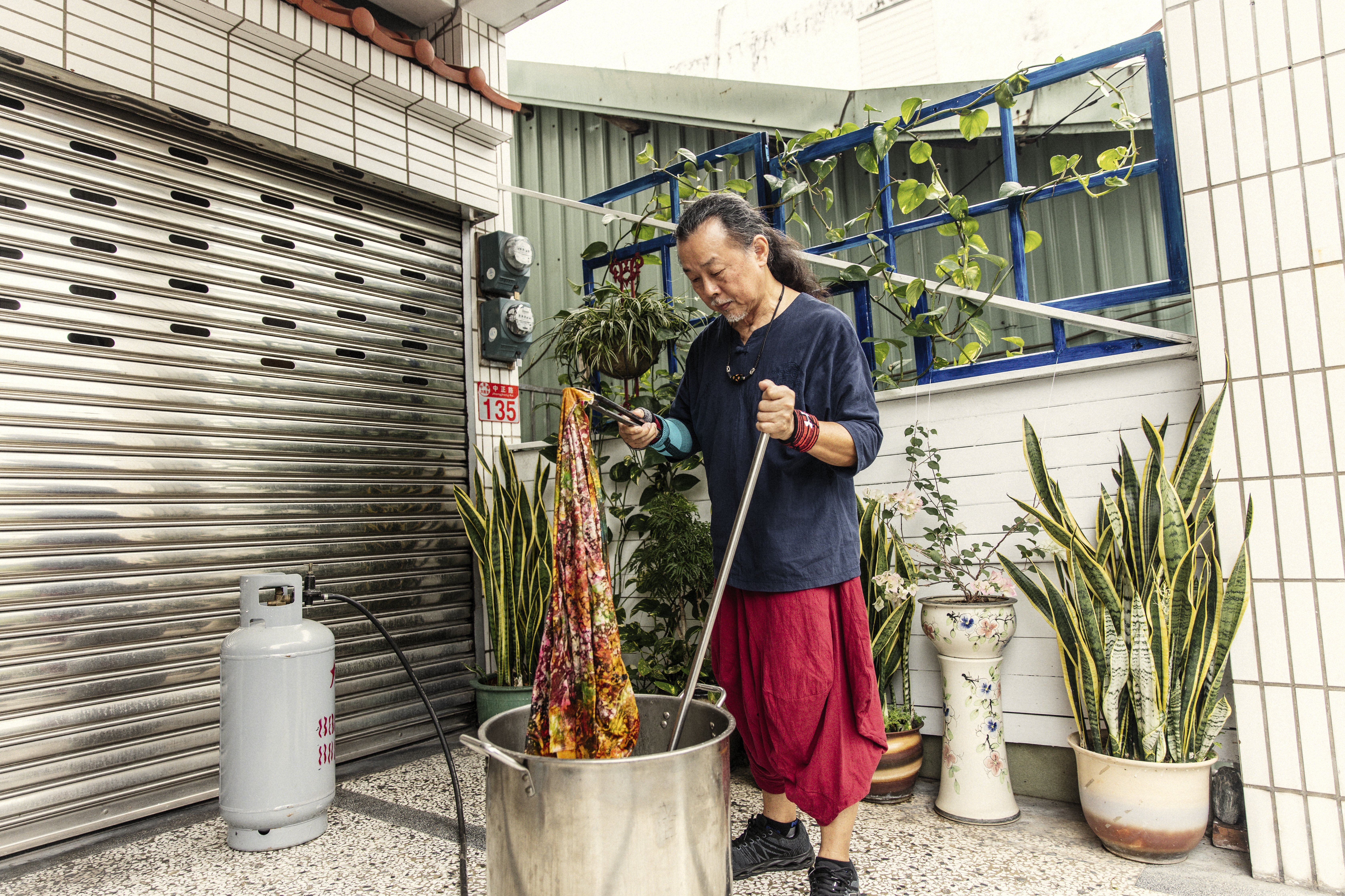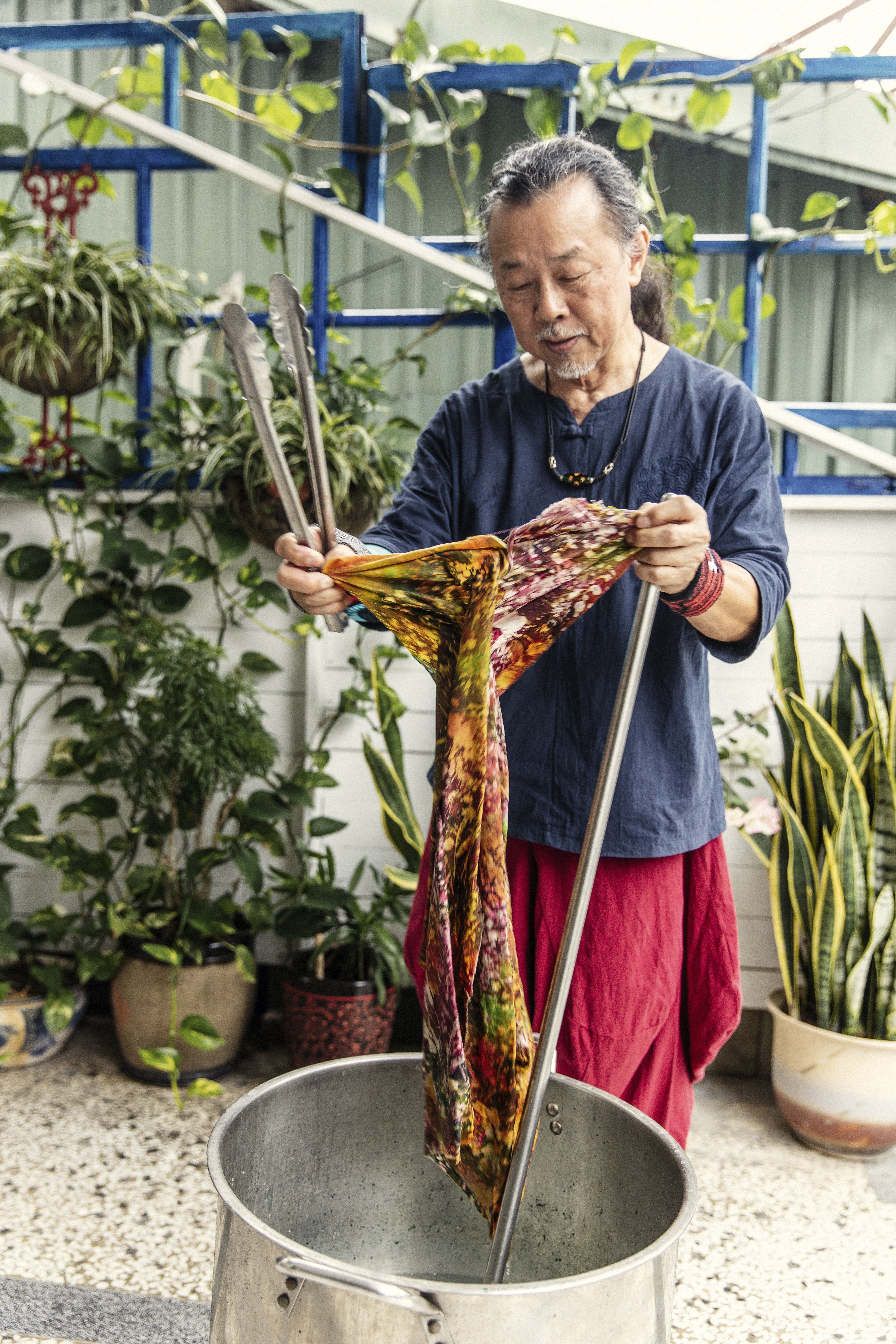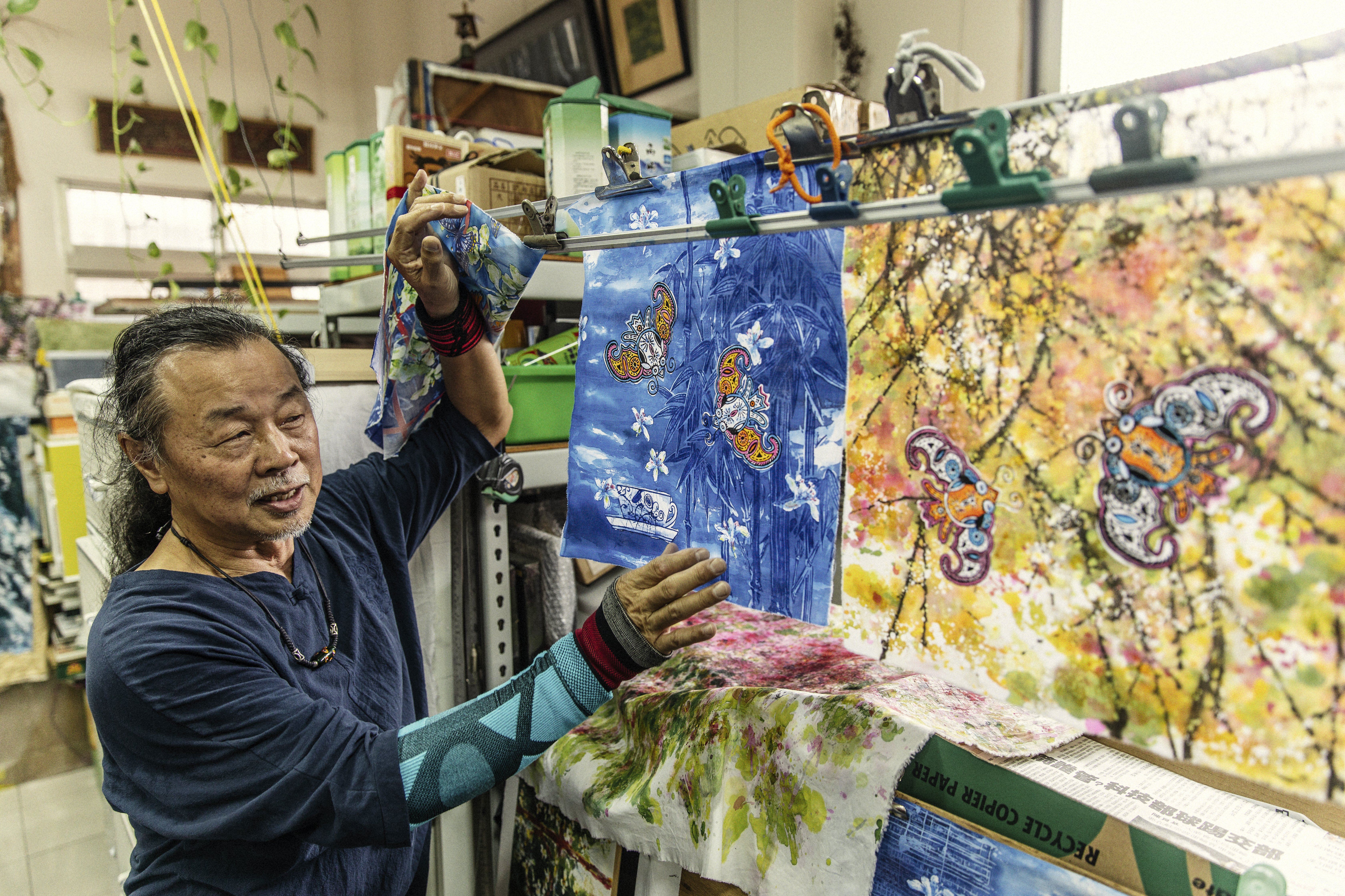 持續鑽研水墨畫創作多年的他,有機會接觸到不同媒材如版畫、蠟染、彩虹染、絹印等,開始思考將不同技法融入於繪畫中,不讓繪畫載體侷限於紙張,嘗試翻轉藝術新的可能性。從學校退休後,他與太太林敏雀一起推動印染藝術創作教學,蠟染印染作畫技法與一般繪畫相反,必須把想要留白的部分用蠟先封住,避免棉布被後續的顏色染印上去,再依顏色深淺一層蠟封一層將畫作依序完成,將色彩倒著彩繪上去,由於蠟有厚度,所以顏色也會依著不同裂紋而滲透,產生游絲般的色紋,每一張印染都是唯一,無法複製。