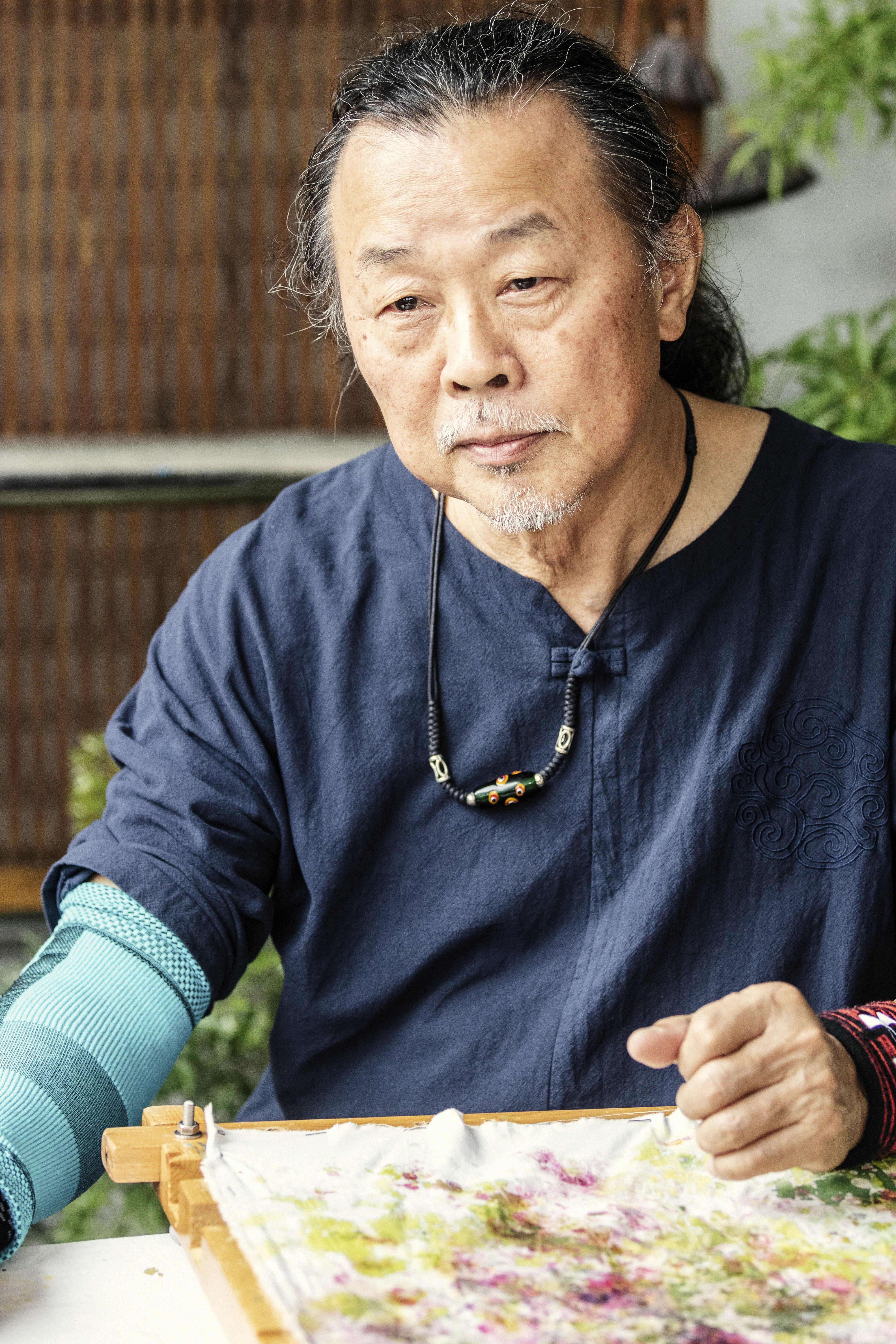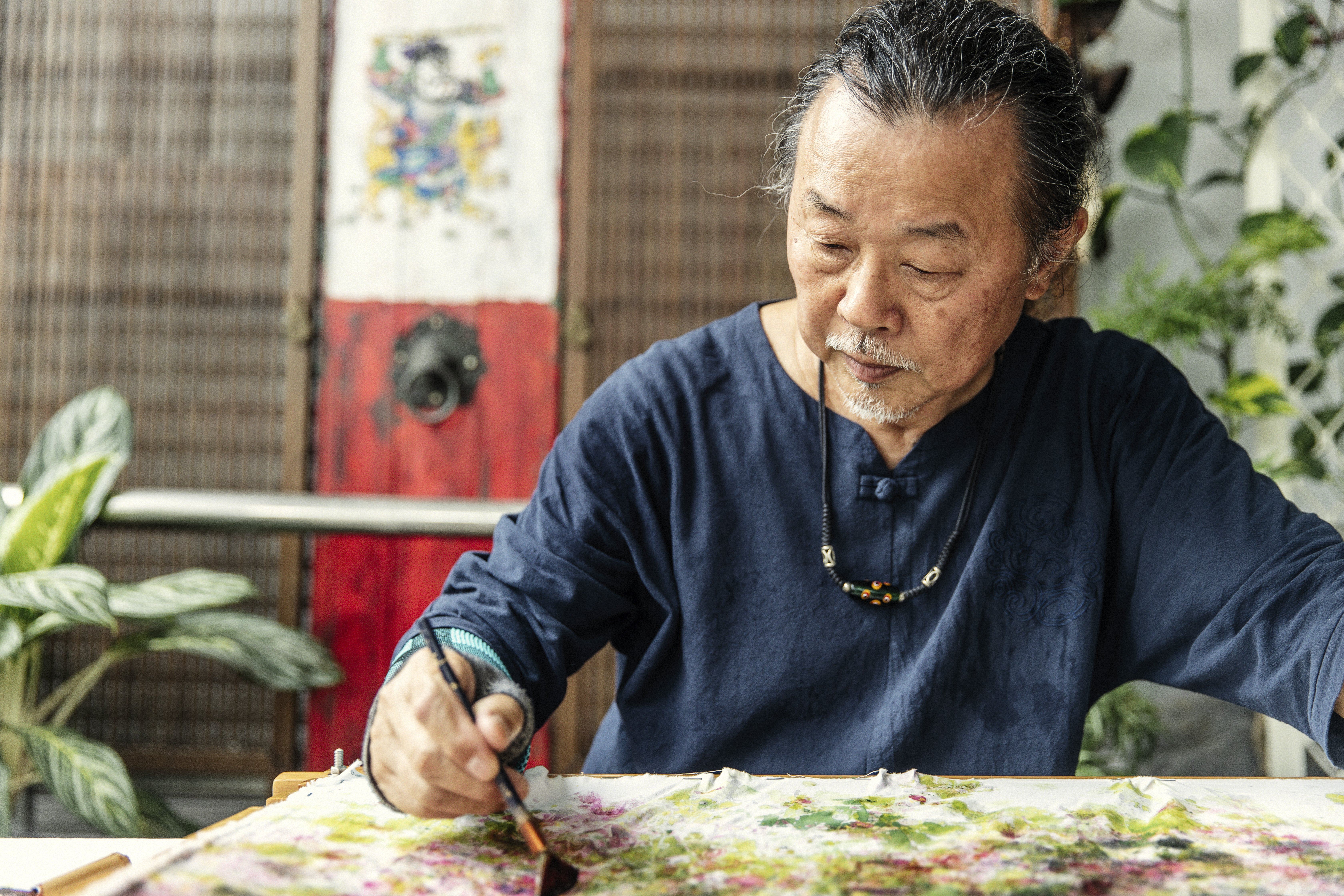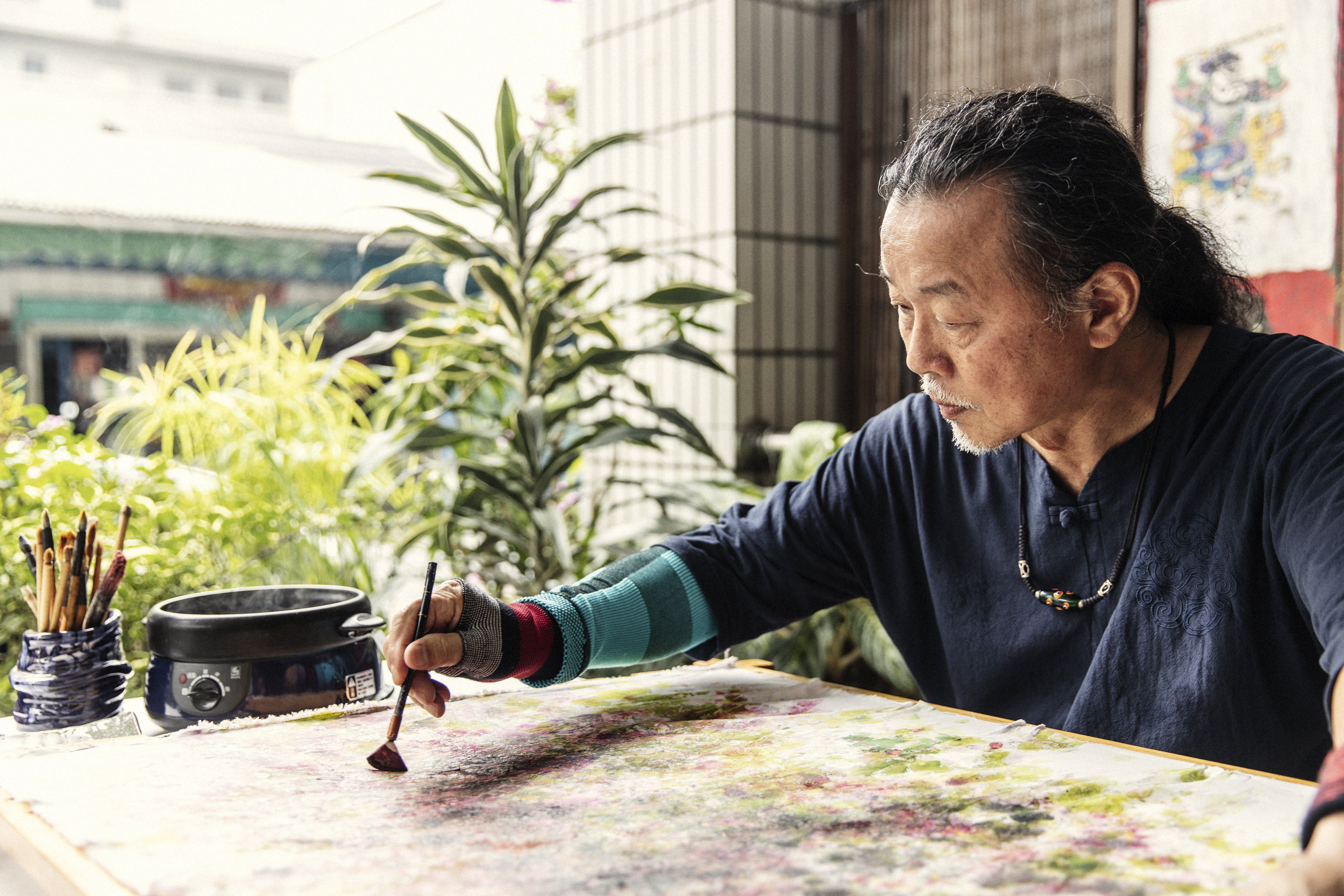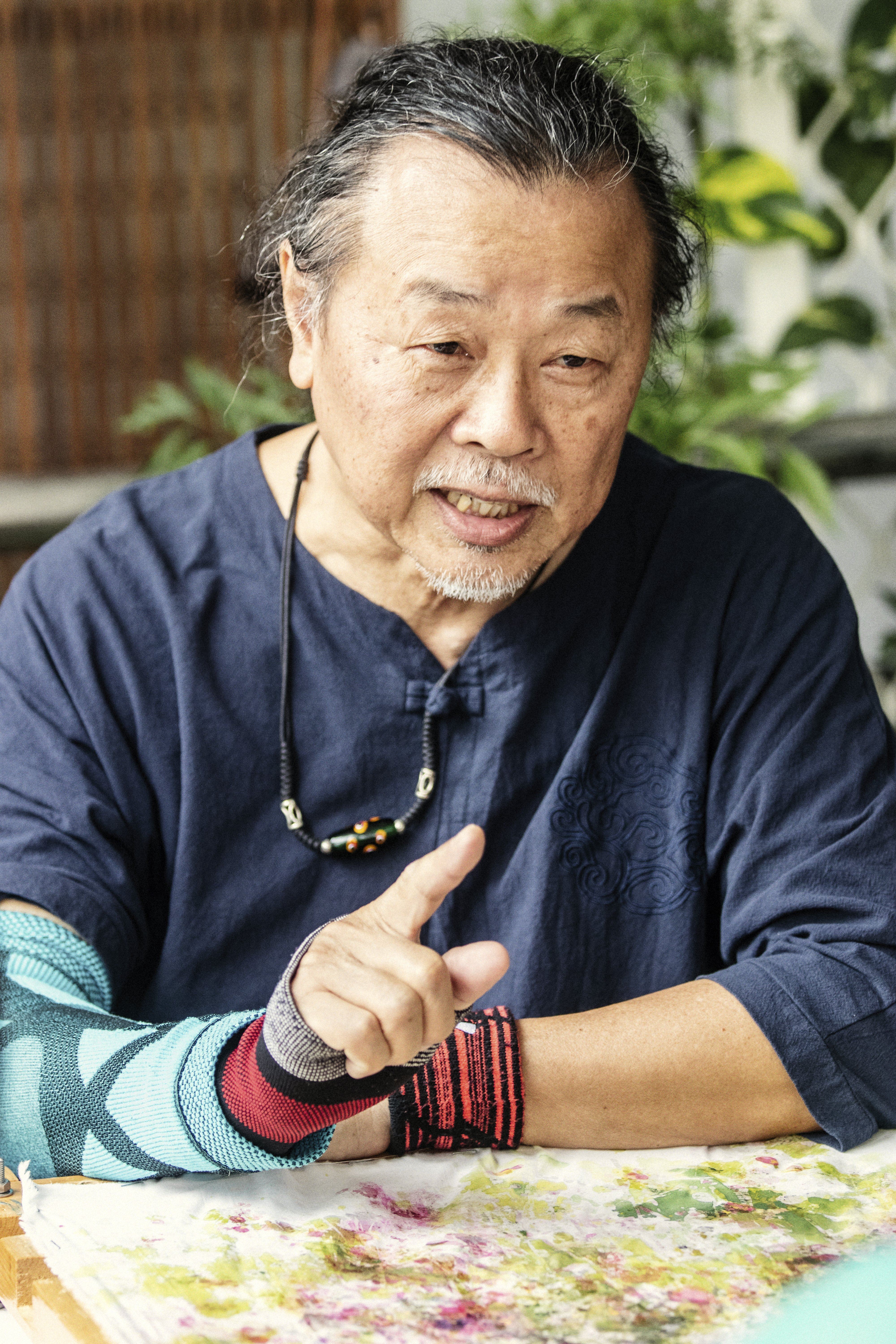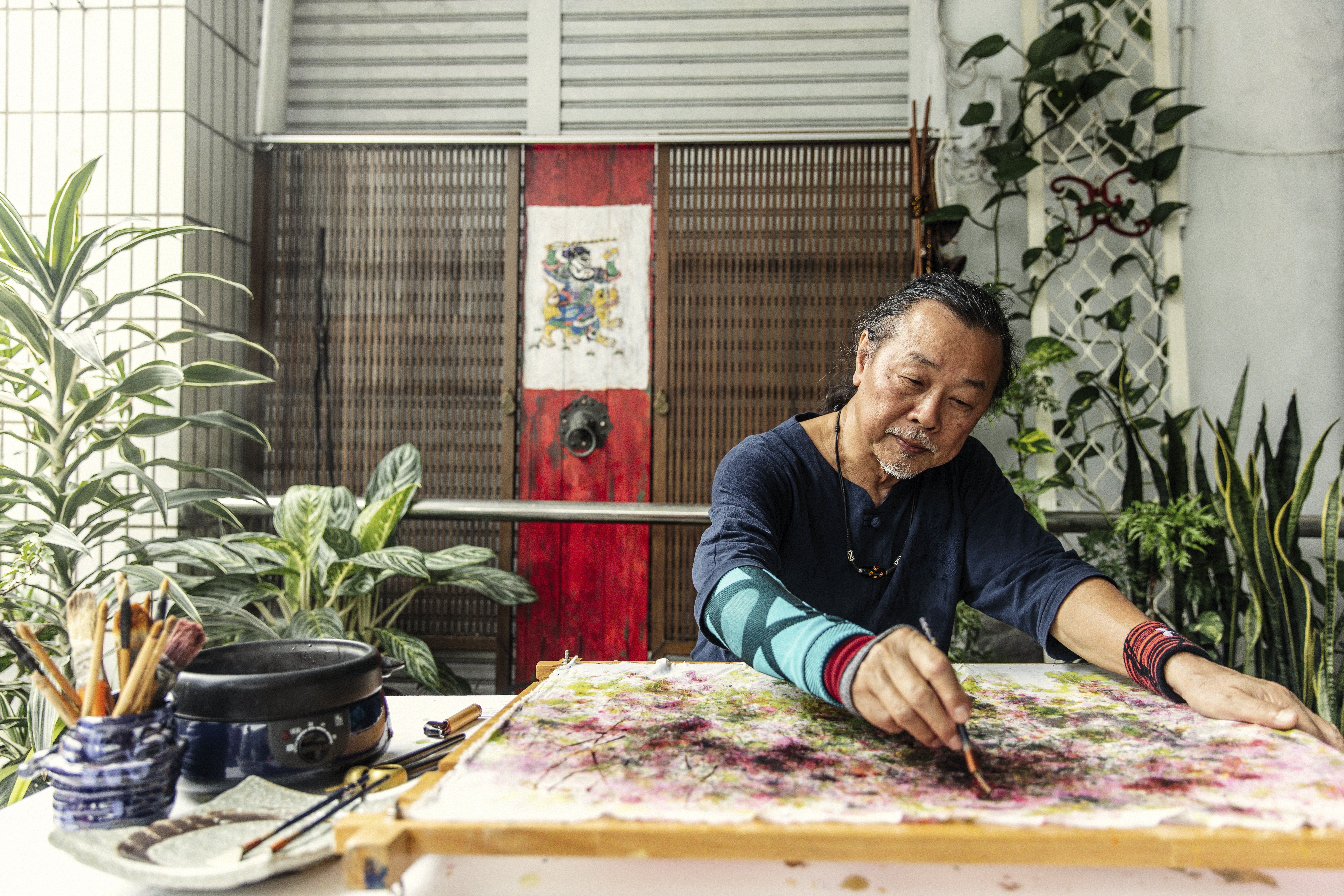 持續鑽研水墨畫創作多年的他,有機會接觸到不同媒材如版畫、蠟染、彩虹染、絹印等,開始思考將不同技法融入於繪畫中,不讓繪畫載體侷限於紙張,嘗試翻轉藝術新的可能性。從學校退休後,他與太太林敏雀一起推動印染藝術創作教學,蠟染印染作畫技法與一般繪畫相反,必須把想要留白的部分用蠟先封住,避免棉布被後續的顏色染印上去,再依顏色深淺一層蠟封一層將畫作依序完成,將色彩倒著彩繪上去,由於蠟有厚度,所以顏色也會依著不同裂紋而滲透,產生游絲般的色紋,每一張印染都是唯一,無法複製。