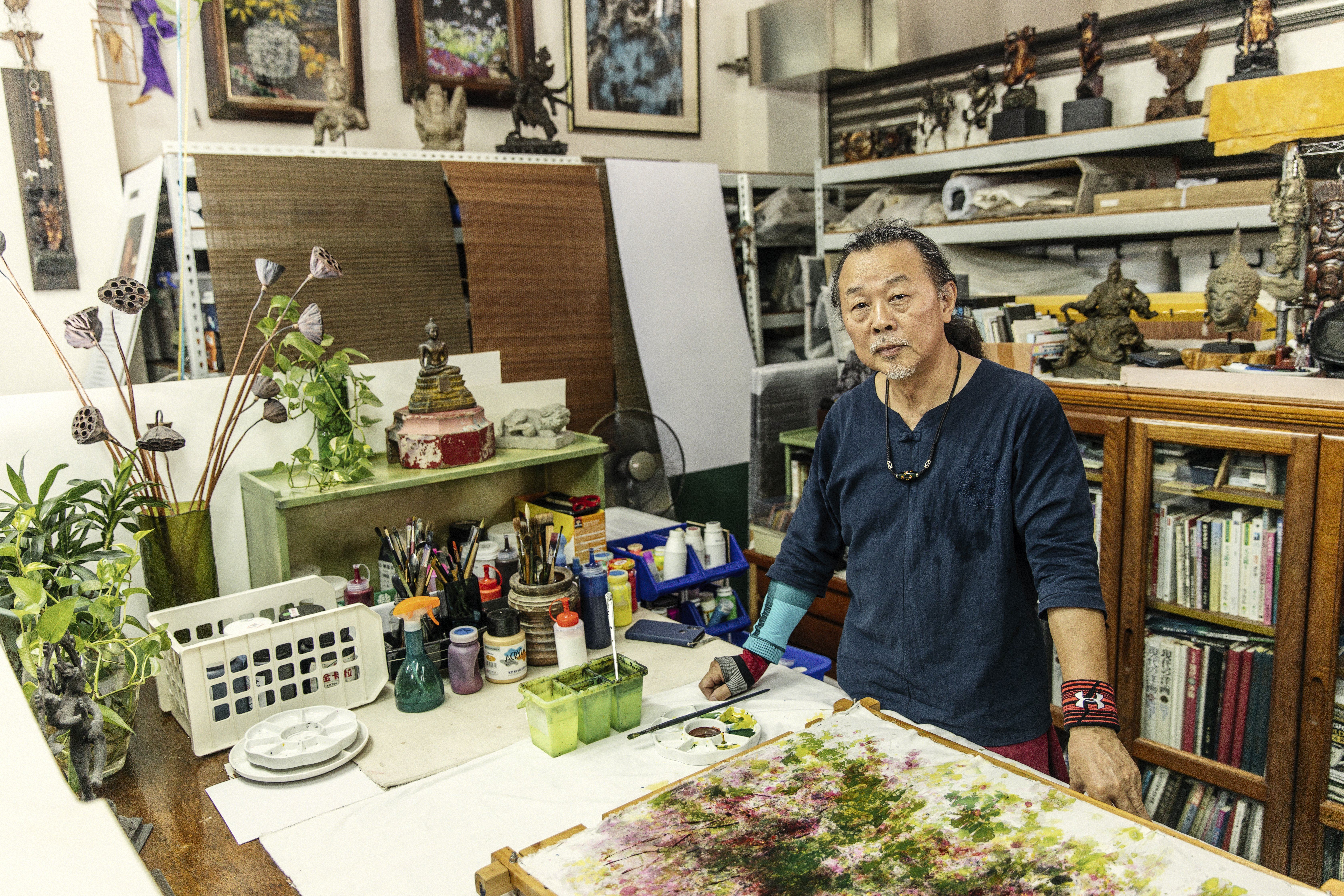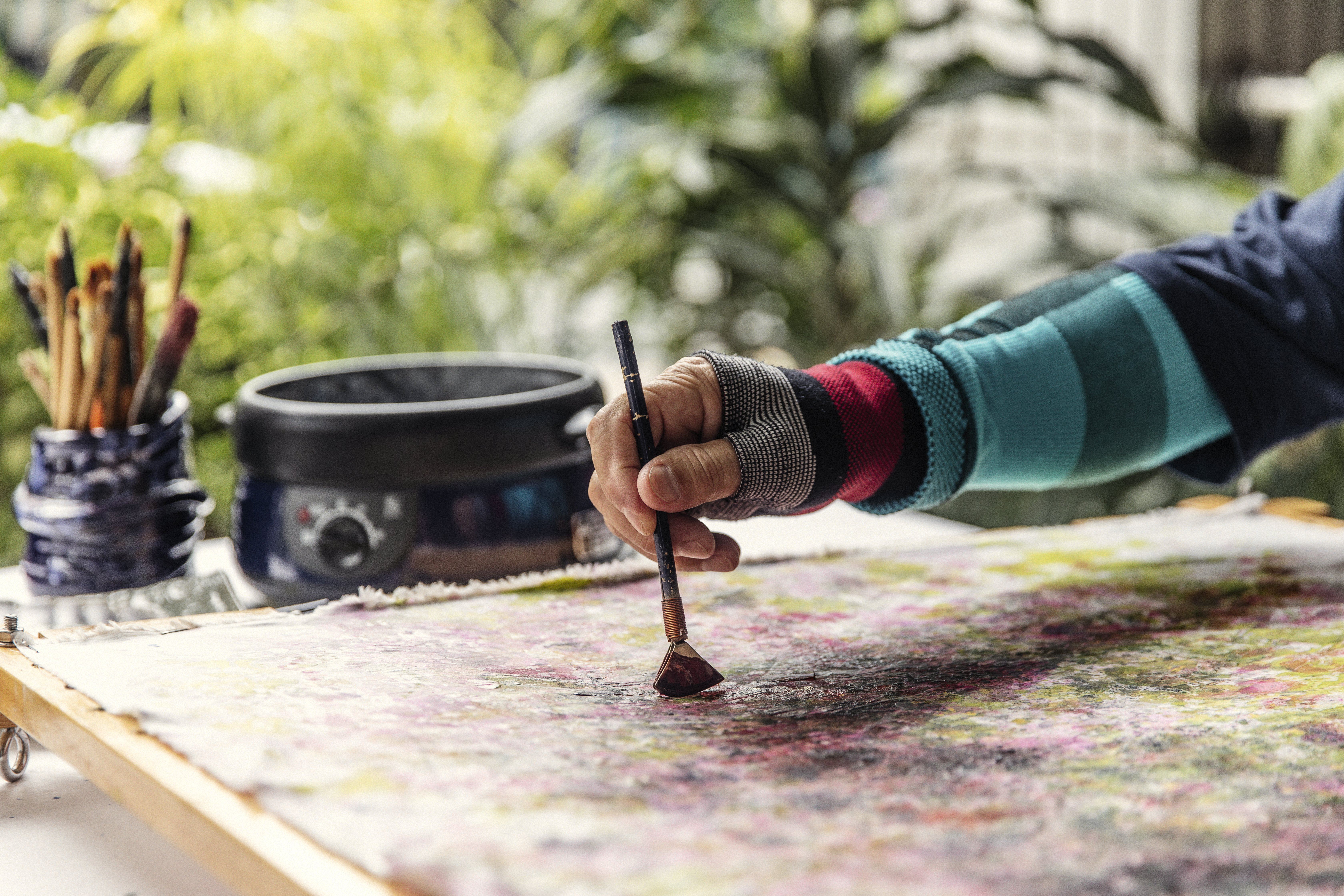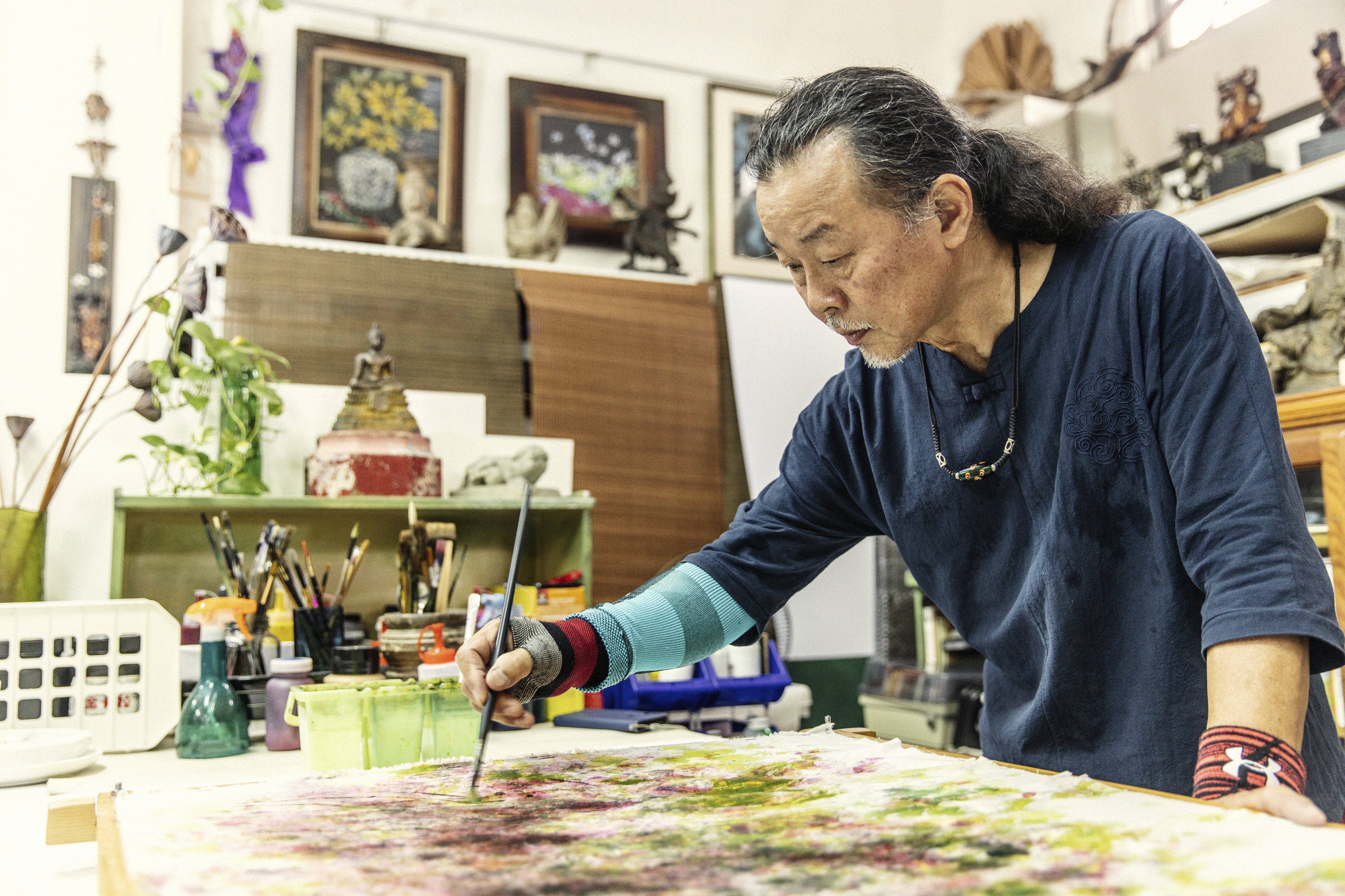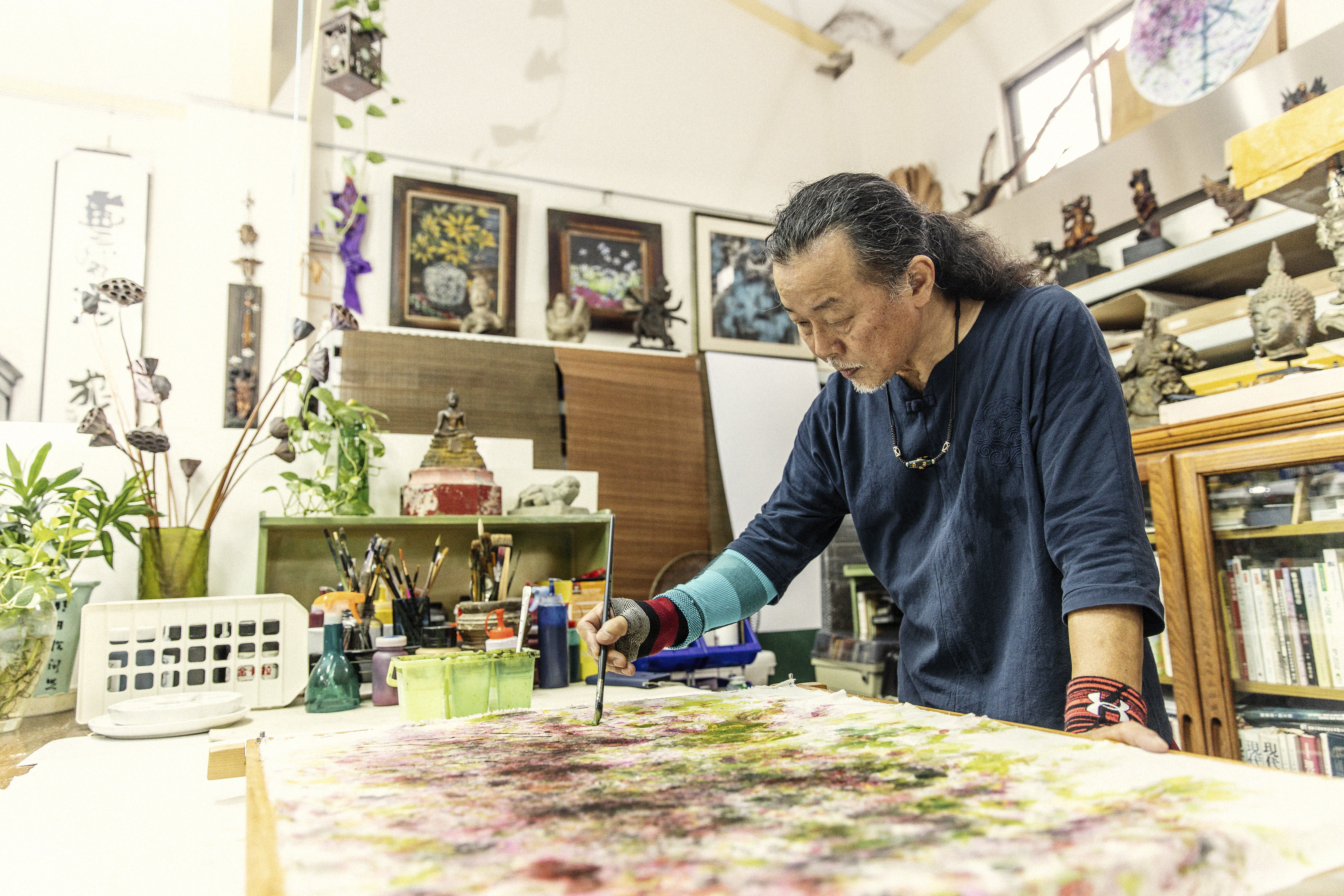 持續鑽研水墨畫創作多年的他,有機會接觸到不同媒材如版畫、蠟染、彩虹染、絹印等,開始思考將不同技法融入於繪畫中,不讓繪畫載體侷限於紙張,嘗試翻轉藝術新的可能性。從學校退休後,他與太太林敏雀一起推動印染藝術創作教學,蠟染印染作畫技法與一般繪畫相反,必須把想要留白的部分用蠟先封住,避免棉布被後續的顏色染印上去,再依顏色深淺一層蠟封一層將畫作依序完成,將色彩倒著彩繪上去,由於蠟有厚度,所以顏色也會依著不同裂紋而滲透,產生游絲般的色紋,每一張印染都是唯一,無法複製。